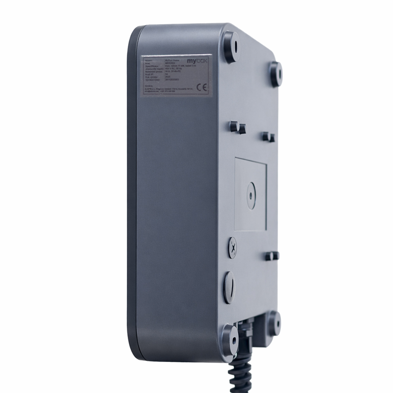 Dobíjecí stanice MyBox HOME pro nabíjení elektroauta je vyrobená z odolného plastu a kaleného skla a je odolná vůči nepříznivým vlivům počasí a mechanickému poškození. Tato stanice nabízí možnost zakázkové úpravy čelního panelu.