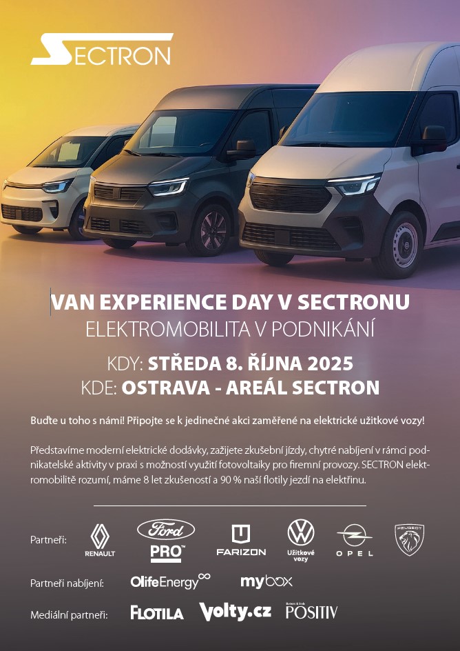 Zveme vás na jedinečnou akci zaměřenou na elektrické užitkové vozy a jejich využití v podnikání. Přijďte se inspirovat, vyzkoušet moderní technologie a dozvědět se, jak může elektromobilita posunout váš firemní provoz kupředu. Akce se uskuteční ve středu 8. října 2025 od 10 - 16 hodin v areálu společnosti SECTRON v Ostravě-Mariánských Horách (Josefa Šavla 12).