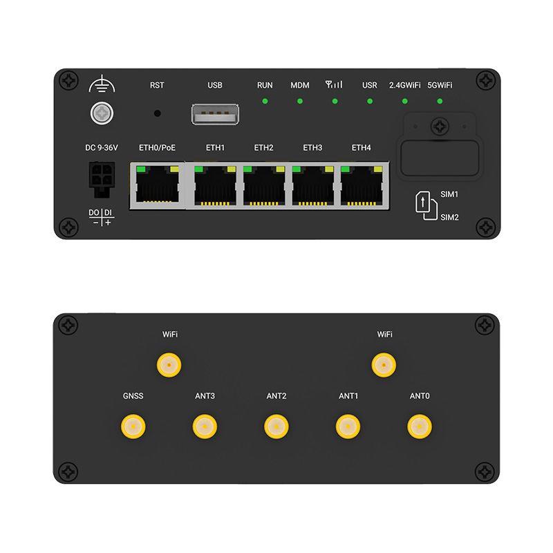Router je vybaven pěti gigabitovými porty (konfigurovatelné jako WAN/LAN) s podporou PoE-PD na ETH0, což umožňuje flexibilní připojení zařízení a jejich napájení bez nutnosti dalších elektrických zásuvek. Pro aplikace v dopravě a logistice je klíčový integrovaný GNSS systém, který poskytuje přesné lokalizační a sledovací služby. Bezpečnost dat je zajištěna funkcemi, jako jsou IPsec a DMVPN, garantující bezpečný a spolehlivý provoz datových sítí.