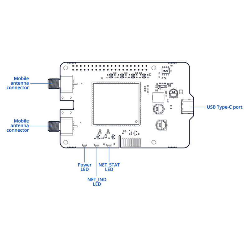 Modul se nasazuje přímo na Raspberry Pi (připojení přes 40pinový GPIO header) a fyzicky tak splývá s deskou, nahrazuje změť kabelů elegantním kompaktním řešením. Je vybaven dvěma anténními konektory SMA (m).