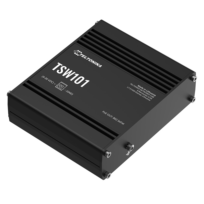 Teltonika TSW101 je první Ethernet switch PoE-A navržený pro použití v automobilech. Switch Teltonika TSW101 je vybaven technologií plug-and-play, která umožňuje rychlé nastavení bez nutnosti další konfigurace a pěti ethernetovými porty s rychlostí až 1000 Mbps. S plnou podporou standardů IEEE802.3 (802.3i, 802.3u, 802.3ab, 802.3x, 802.3az) tento switch zajišťuje spolehlivé připojení k internetu a zároveň poskytuje napájení dalším zařízením.